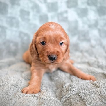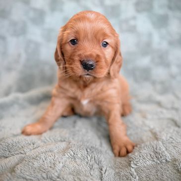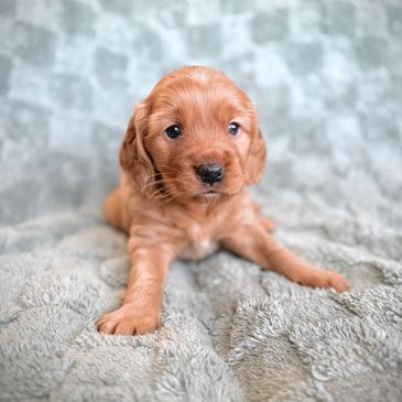 Rosebud is a deep red miniature golden retriever (for some reference, she will likely mature to be either Willow's or Aspen's coloring as she matures) with a long, wavy, low-shedding coat, dark brown eyes, a petite build, and a curious and happy expression.